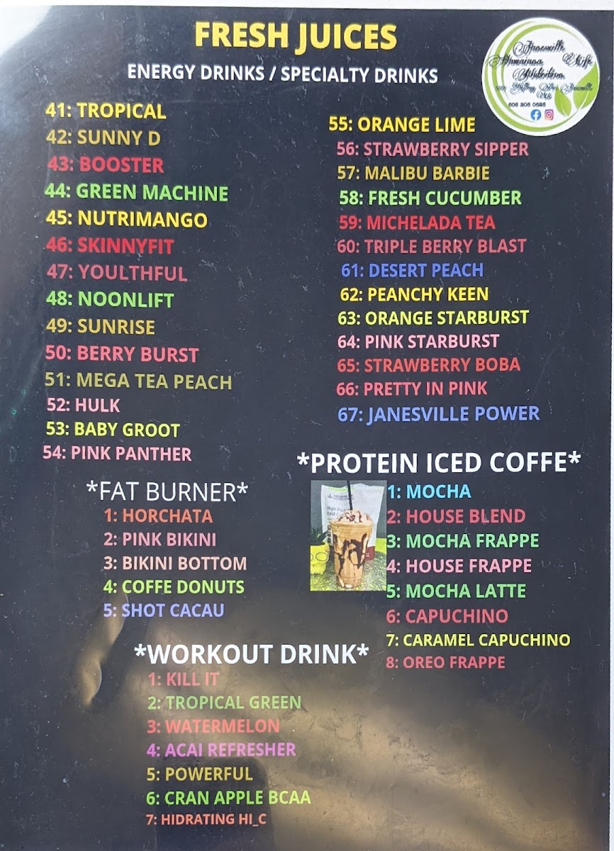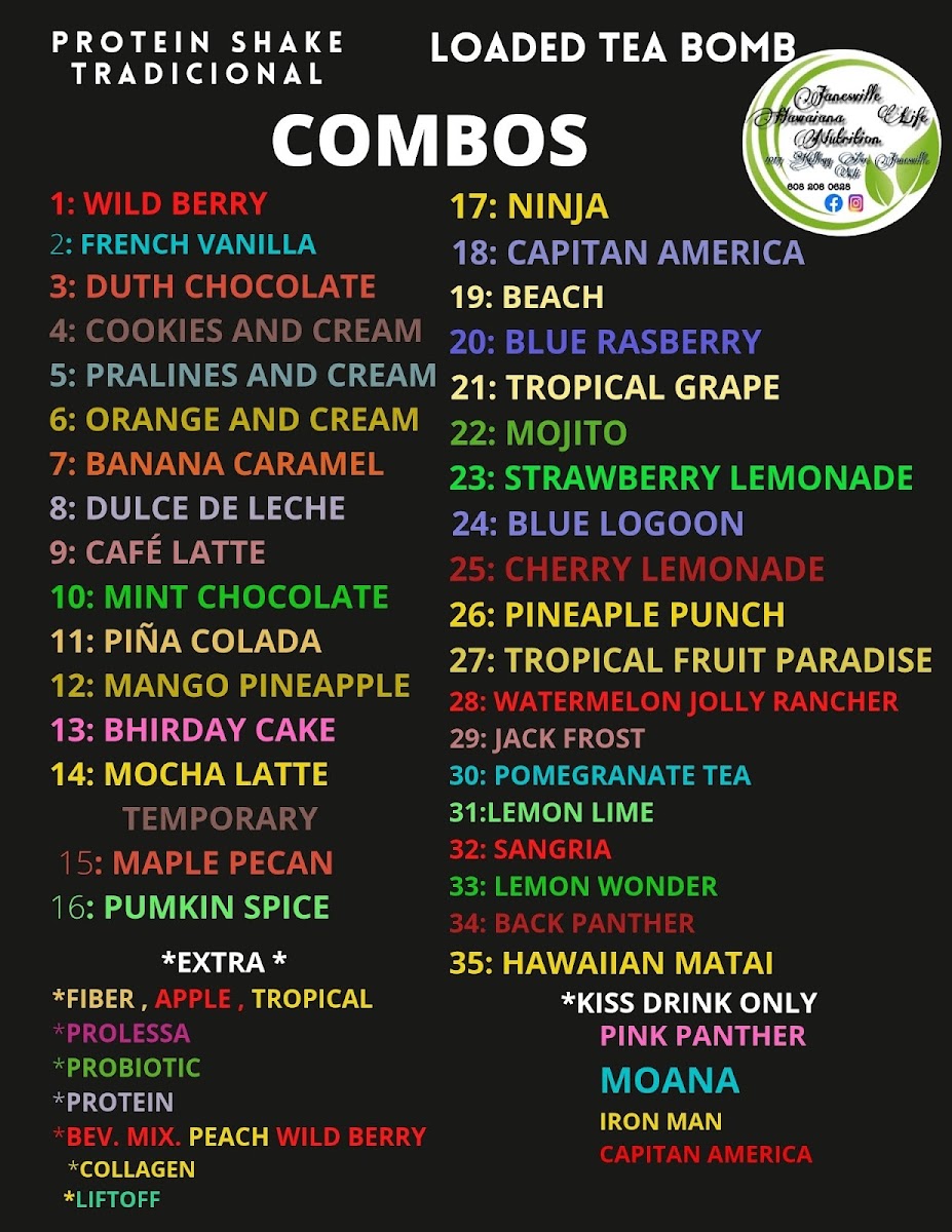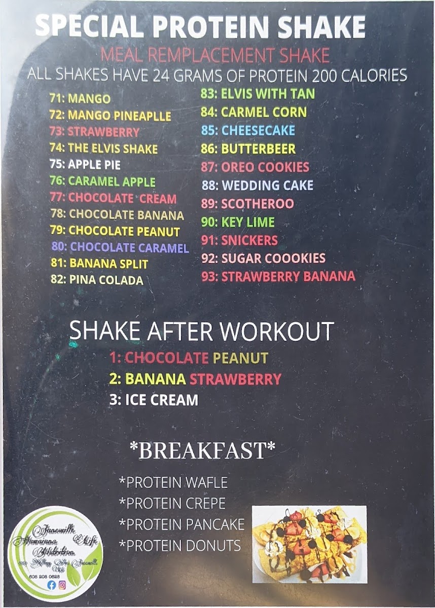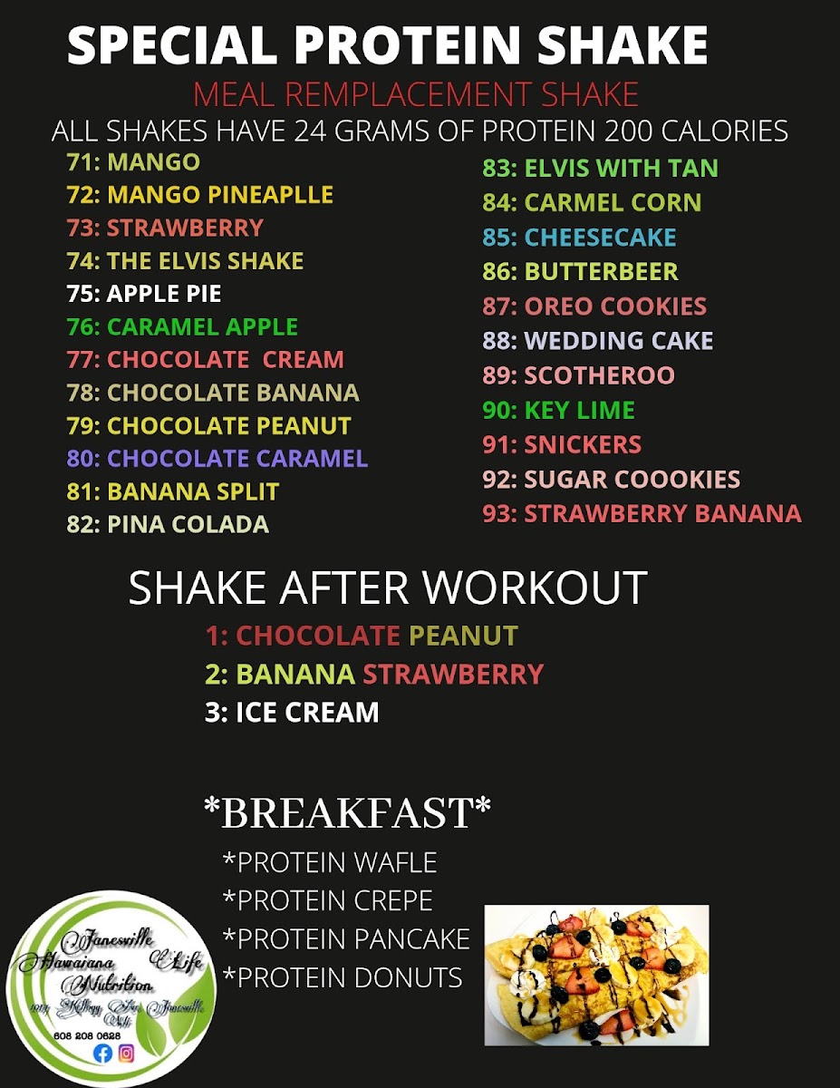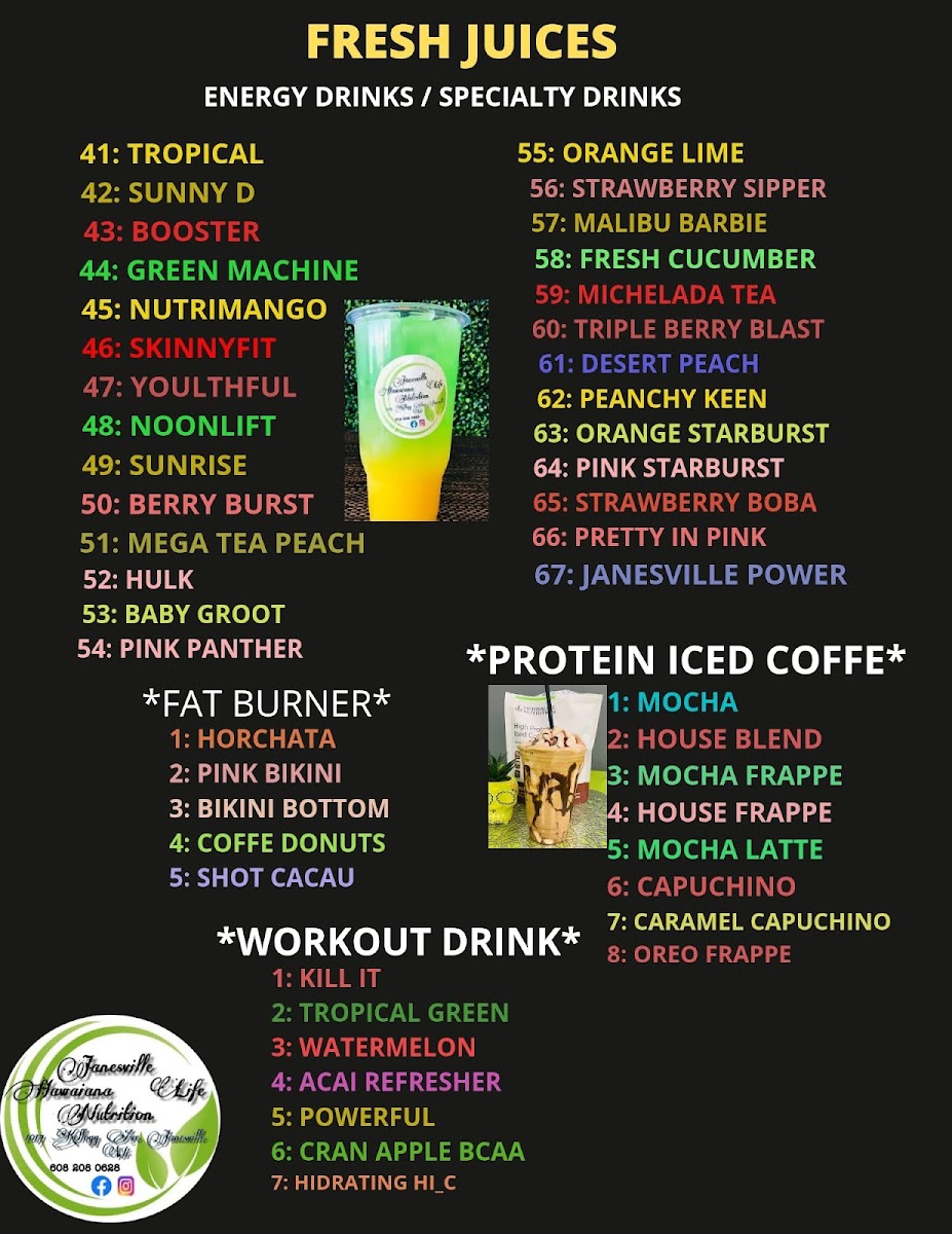 Janesville Hawaiana Life Nutrition offers a diverse and nutritious menu catering to a variety of needs, from post-workout fuel to satisfying meals throughout the day. For those looking to kick-start their day, they offer a range of Protein Coffee options, perfect for a morning boost. The Shake + Leaded Tea Bomb COMBO is a popular choice for those craving an energizing and filling drink, combining the best of both worlds. Their menu also includes a variety of Protein Shakes tailored for workout recovery, making it a great stop for fitness enthusiasts. Whether you're in the mood for a hearty meal or a quick, refreshing drink, Janesville Hawaiana Life Nutrition has something to satisfy every craving, making it a go-to spot for both breakfast and lunch. The prices are reasonable for the value provided, though specific details may vary depending on the selection.
